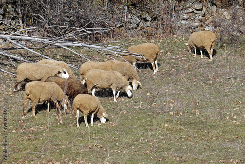 © planeta11, Obraz premium grupo de borregas de lana paciendo en la dehesa