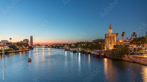 Fototapeta premium Guadalquivir River near Torre del Oro day to night timelapse in Seville, Spain