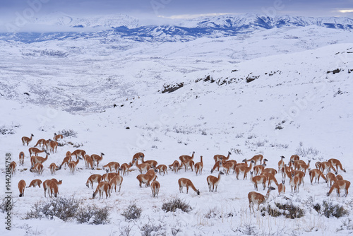 Fototapeta premium Guanaco in Chile, Torres del Paine NP in Patagonie. Winter with snow in South...