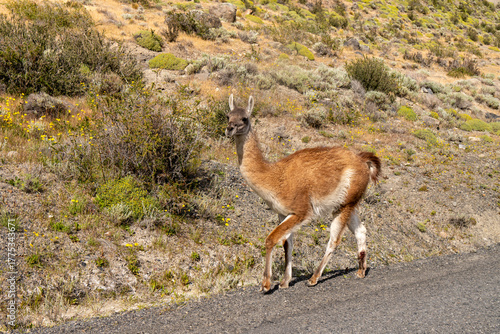 © ANADEL, Obraz premium Guanacos at Torres del Paine National Park is one of Chile's most important protected wilderness areas. It is located between the Andes Mountains and the Patagonian steppe. Chile, South America