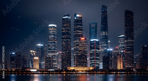 Fototapeta premium Guangzhou City Skyline at Night Skyscrapers and City Lights Reflected
