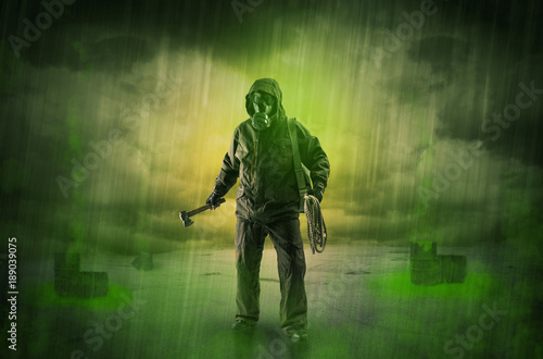 Fototapeta premium Guard in an abandoned space after explosion