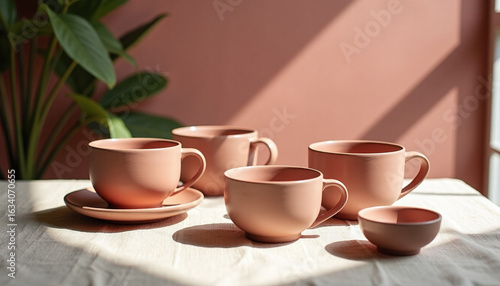 © Svetlanakras, Obraz premium Guava pink ceramic mugs and bowls arranged on neutral linen tablecloth in soft sunlight, minimal kitchen interior with natural shadows and cozy atmosphere