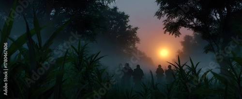 © ckybe, Obraz premium Guerrilla fighters silently navigate the dense forest at dawn filled with tense anticipation