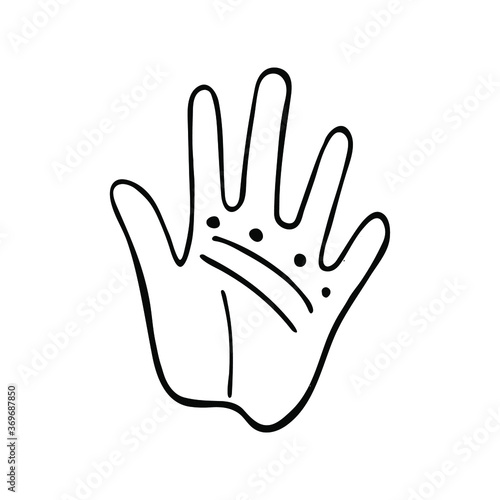 Obraz premium Guessing on the hand line.fortune telling. elements about magic and chiromancy, divination. Hand drawn hand with magical symbols. Isolated on white backdrop.