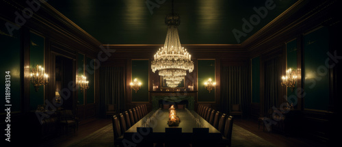 © Zazi, Fototapeta premium guest room featuring a velvet-upholstered bed in deep green, gold-accented nightstand