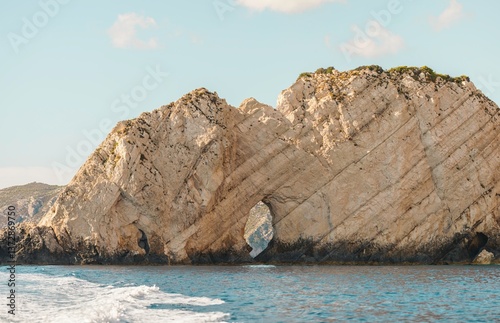 Naklejka premium Guests enjoy a boat trip in Greece, marveling at unique rock formations and natural arches along the coastline under a clear blue sky during summer, creating a perfect getaway experience