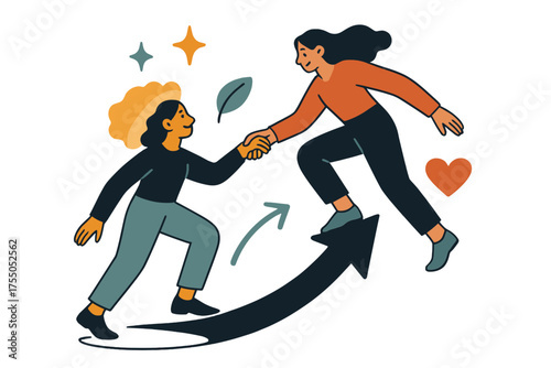 © Svitlana, Obraz premium Guiding Growth Icons. Mentorship. Glowing woman guiding another woman upward with supportive hand. Floating icons of sparkle, heart, and leaf symbolizing