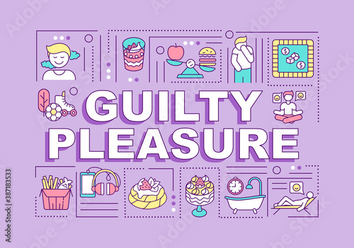 © IMG visuals icons, Fototapeta premium Guilty pleasure word concepts banner. Enjoy things. Minor feeling of guilt. Infographics with linear icons on purple background. Isolated typography. Vector outline RGB color illustration
