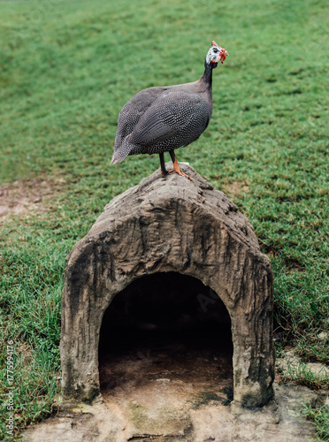 © Supatinee, Fototapeta premium Guinea Fowl Standing on Rock Perch in Green Outdoor Setting