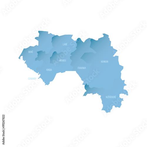 Fototapeta premium Guinea political map of administrative divisions - regions. Shaded vector map with 3D-like blue gradient and name labels