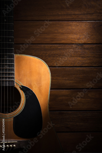 © Theeradech Sanin, Obraz premium Guitar on wood background.