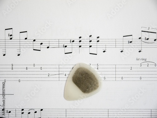 Fototapeta premium Guitar pick on note sheet with tabs