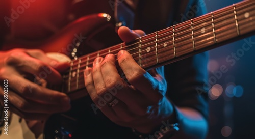 © Alleuy, Obraz premium Guitar player hands playing the electric guitar close up in dim light