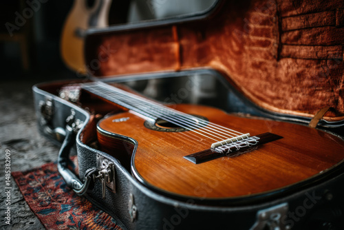 © Barno, Fototapeta premium Guitar resting on suitcase.