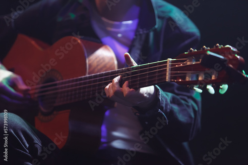 Obraz premium Guitarist playing acoustic guitar on concert stage