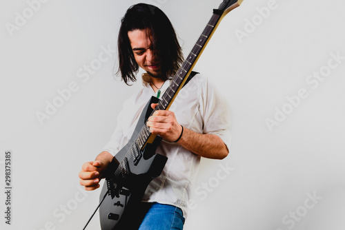 Fototapeta premium Guitarist posing with his electric guitar, white background.