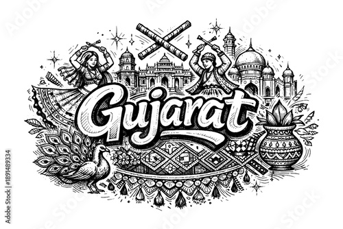 Fototapeta premium Gujarat celebration: traditional dance and architecture in detailed ink art