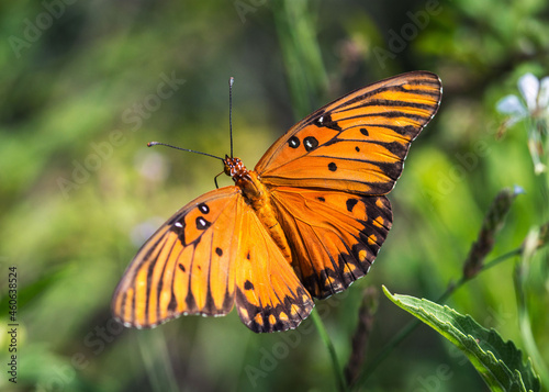 © Lawrence Jefferson, Fototapeta premium Gulf Fritillary with open wings along the nature trail in Pearland, Texas!