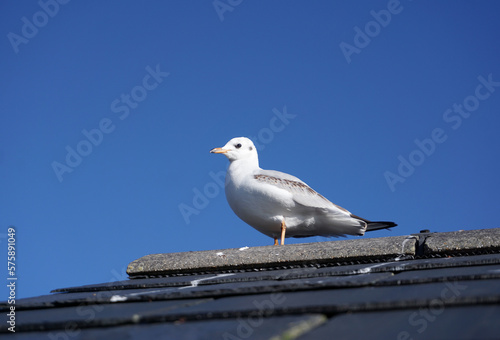 Obraz premium gull bird standing on rooftop. A white and grey seagull standing on coastal...
