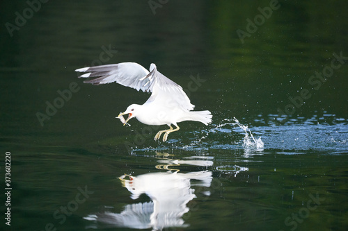 © rocchas75, Fototapeta premium Gull Larus Canus catching a fish at lake