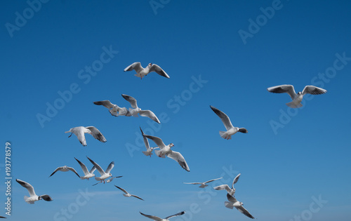 © Joerg, Fototapeta premium Gull (Larus ridibundus) in flight on the natural blue sky background