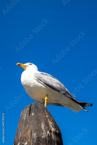 © travelview, Obraz premium gull sitting on a pillar under blue sky