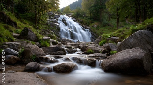 © Thares2020, Obraz premium Gushing cascade waterfall with mist over mossy rocks at dawn serene forest landscape