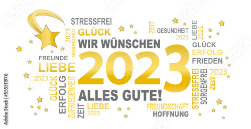 © manu, Naklejka premium gute wünsche für das neue jahr 2023 mit goldener und grauer schrift und sternen