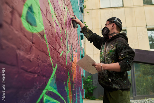 Obraz premium Guy in casual attire and protective mask standing in front of wall of building and painting graffiti artwork in the city