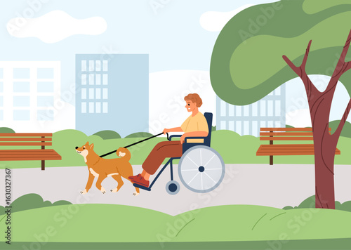 Fototapeta premium Guy in wheelchair walks dog in city park. Disabled persons outdoor stroll. Pet leading handicapped man. Trained animal help boy with disability. Handicap accessibility. Vector concept