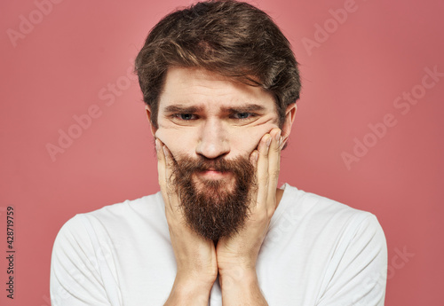 Obraz premium Guy touches his face with his hands on a pink background cropped view