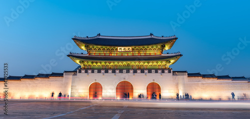 © Atakorn, Fototapeta premium Gyeongbokgung Palace At Night In South Korea, with the name of the palace 'Gyeongbokgung' on a sign