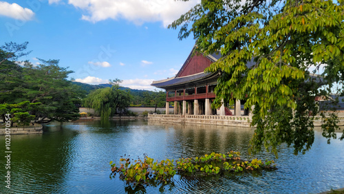 Naklejka premium Gyeongbokgung Palace, with blue sky on a sunny day, in Seoul, South Korea