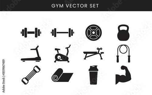 © tarakacraft, Fototapeta premium Gym and Fitness Icons. Vector Workout Equipment Silhouette Set.