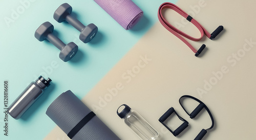 © Diana, Naklejka premium gym items, top view with space for text, simple background, negative space