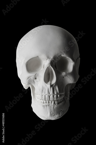 © Ded Pixto, Naklejka premium Gypsum human skull on isolated black background with clipping path. Plaster sample model skull for students of art schools. Forensic science, anatomy and art education concept. Mockup for drawing.
