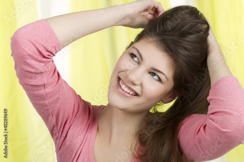 Fototapeta premium Hübsche junge Frau steckt ihre langen Haare zusammen