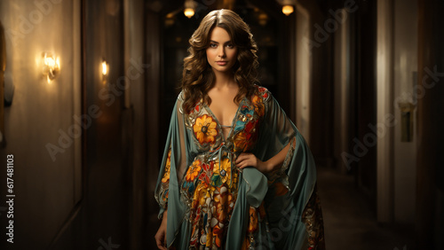 © www.freund-foto.de, Fototapeta premium Hübsche Marokanerin im traditioneller Kleidung im Kimono Stil bunt mit Blumen, ai generativ