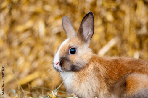 © DoraZett, Fototapeta premium Hübsches Zwergkaninchen sitzt auf Strohballen