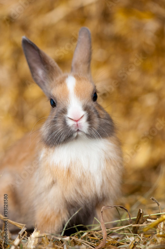 © DoraZett, Fototapeta premium Hübsches Zwergkaninchen sitzt auf Strohballen