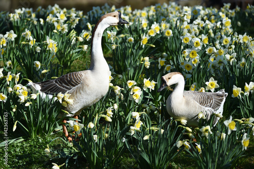 © dieter76, Obraz premium Höckergans in Osterglocken