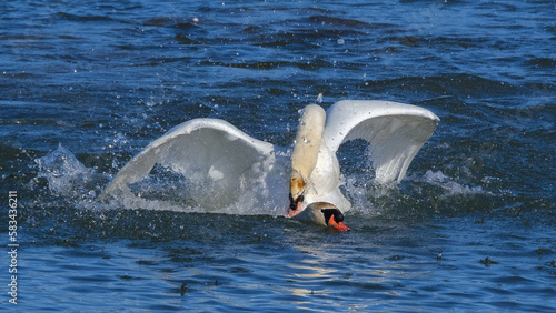 © Karin, Fototapeta premium Höckerschwan versucht den Gegner beim Revierkampf zu ertränken