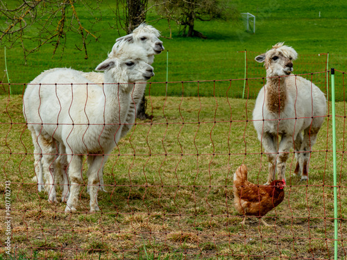 © focus finder, Fototapeta premium Hühner und Lamas am Hühnerwagen