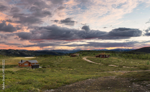 Obraz premium Hütten in Landschaft von Norwegen im Sonnenuntergang
