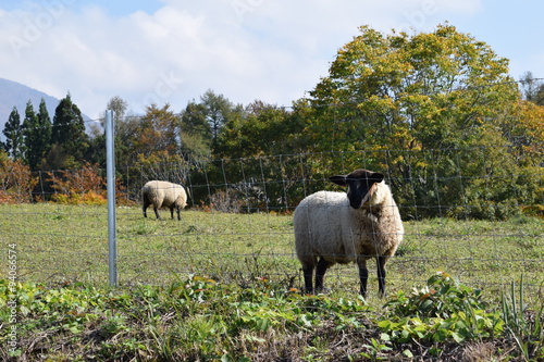 Obraz premium 羊の放牧/山形県鶴岡市羽黒町川代にある月山高原牧場で、羊の放牧風景を撮影した写真です。この牧場は、約100haの緑のジュウタンが広がり、雄大な高原の中で牛や羊を眺められます。羊を放牧すると足腰が丈夫になる、広々とした牧場で運動することにより健全な羊になる、管理の手間が省ける、エサ代の削減など良いこと尽くしです。高原からの眺めは最高で、ひそかな観光ポイントになっています。