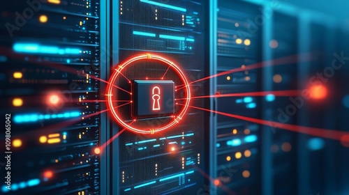 Obraz premium Hacker Cybersecurity Black Hat Secure data storage with digital lock highlighted in server room.