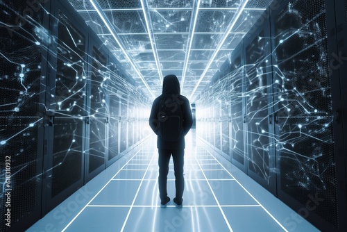 Obraz premium Hacker in a sever room, Unleashing the Futuristic Technoverse: Silhouette Hoodie Man Ventures into an Action-Packed Data Center, Engaging with Boundless Innovation amidst Opacity and Radiant Clusters