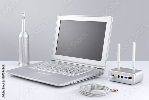 Fototapeta premium Hacker monitoring Wi-Fi traffic using a USB adapter and custom antenna
