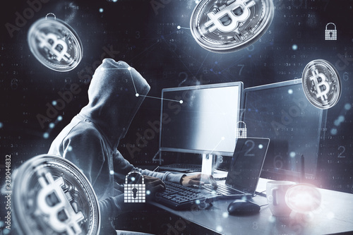 © Who is Danny, Naklejka premium Hacker working on computer with flying bitcoin